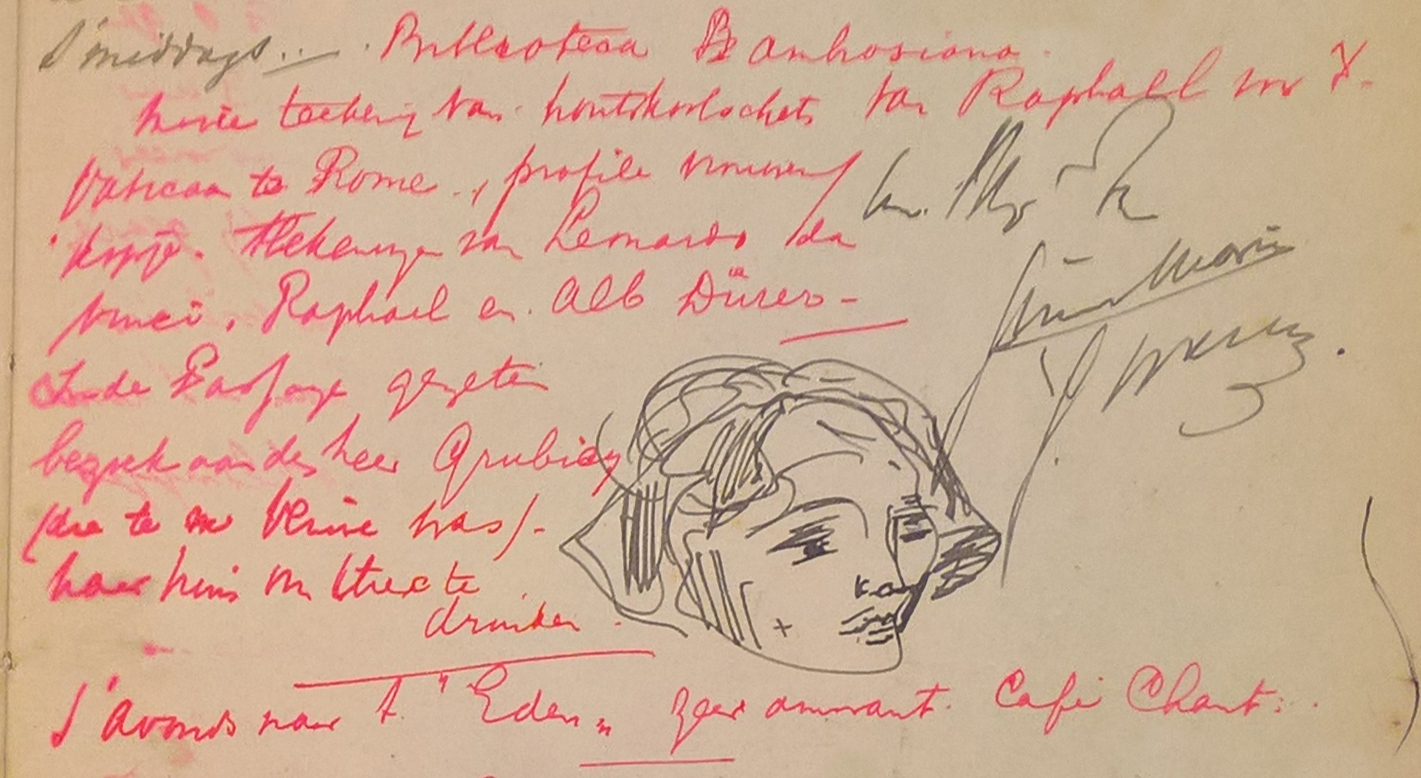 Lambert werkt dus om de Prix de Rome [4] te krijgen en maakt zooveel heiligen als maar denkbaar is. ’s Avonds zaten we in de Grand Opera Theatre Francais en hoorden “La Cigale et la Fourmi”. Vluchtig zagen we hiet ’t museum Plantin. ’s Avonds d.a.v. naar ’t Arena van Schumann en togen den volgenden morgen naar Brussel.